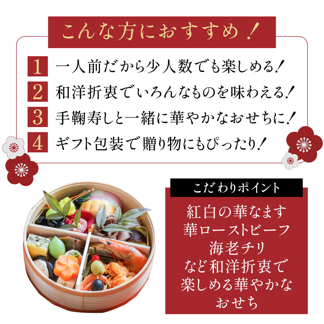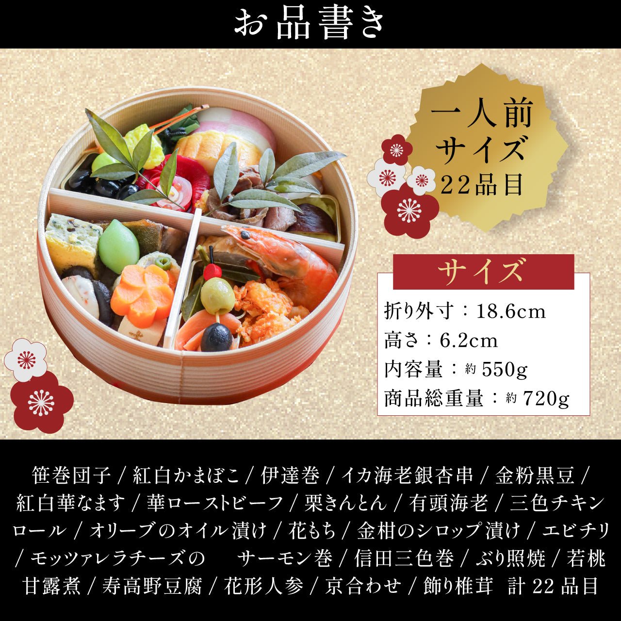 笹巻団子/紅白かまぼこ/伊達巻/イカ海老銀杏串/金粉黒豆/紅白華なます/華ローストビーフ/栗きんとん/有頭海老/三色チキンロール/オリーブのオイル漬け/花もち/金柑のシロップ漬け/エビチリ/モッツァレラチーズの サーモン巻/信田三色巻/ぶり照焼/若桃甘露煮/寿高野豆腐/花形人参/京合わせ/飾り椎茸 計22品目
