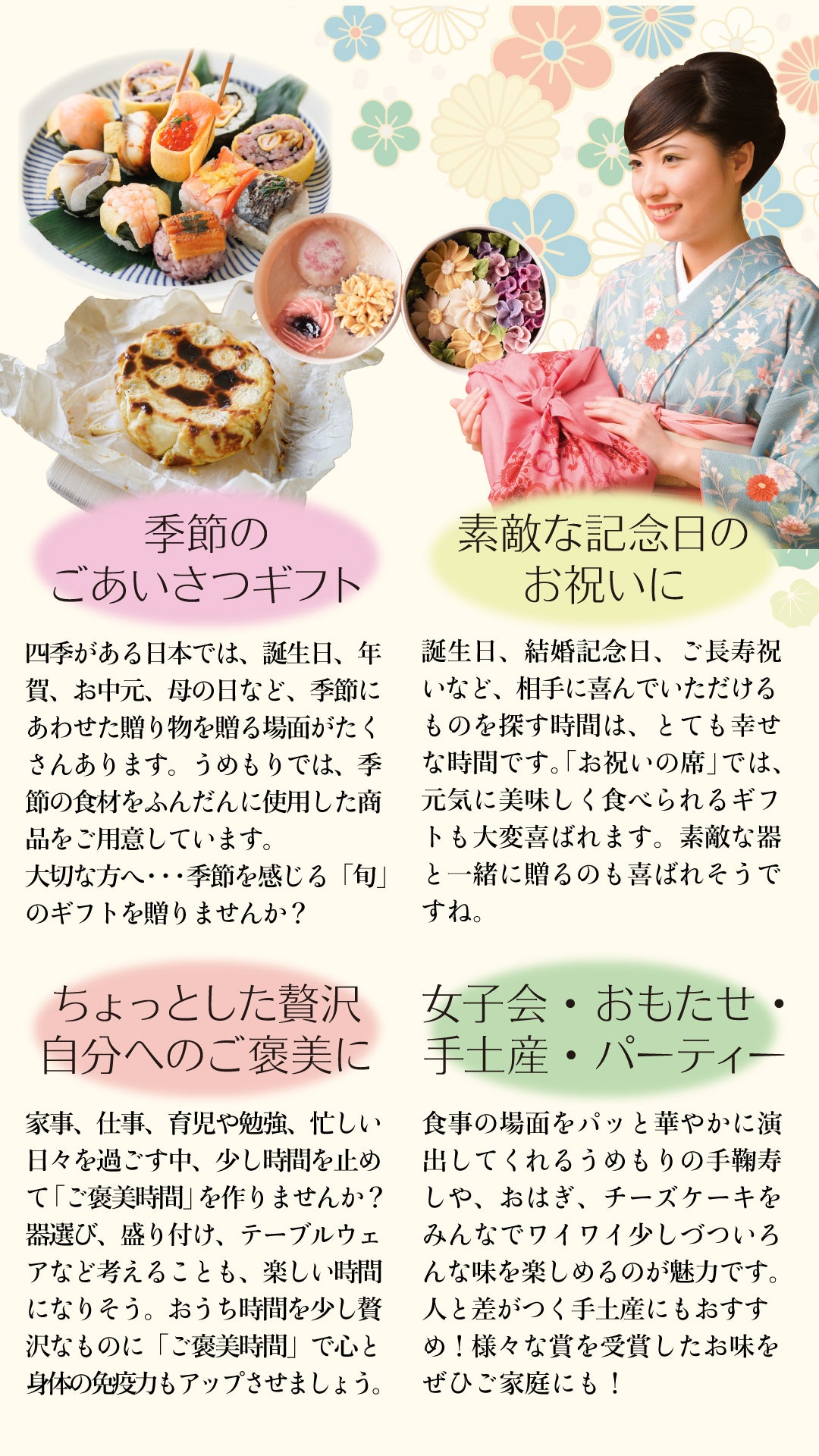 奈良発「うめもり」の公式通販サイトでは、自社製造の手鞠わさび葉寿しをはじめ、無添加の花おはぎや、チーズケーキ専門店MAHOROWAのスイーツなど、贈り物にも喜ばれる商品を全国へお届けしています。