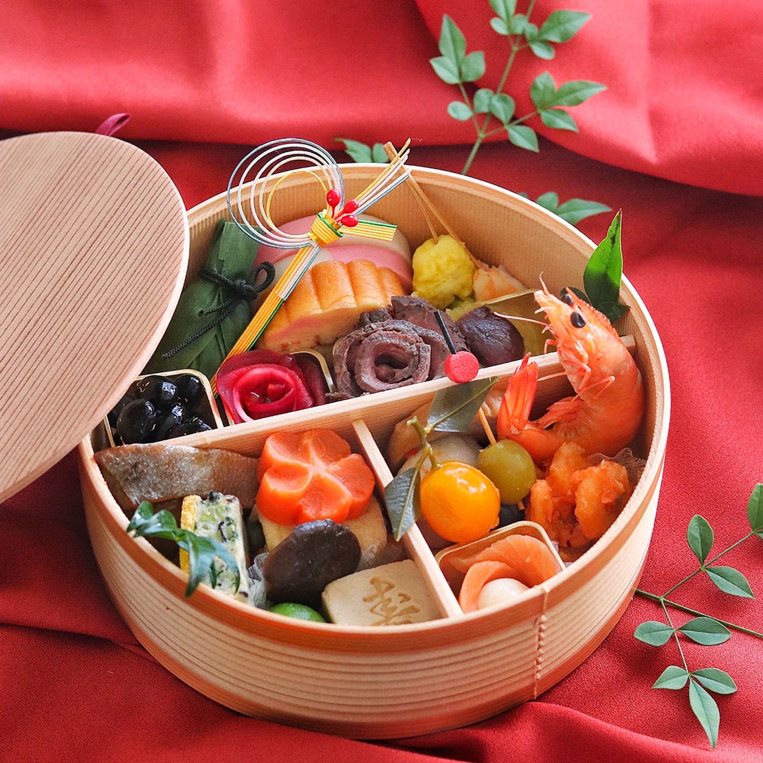 笹巻団子/紅白かまぼこ/伊達巻/イカ海老銀杏串/金粉黒豆/紅白華なます/華ローストビーフ/栗きんとん/有頭海老/三色チキンロール/オリーブのオイル漬け/花もち/金柑のシロップ漬け/エビチリ/モッツァレラチーズの サーモン巻/信田三色巻/ぶり照焼/若桃甘露煮/寿高野豆腐/花形人参/京合わせ/飾り椎茸 計22品目