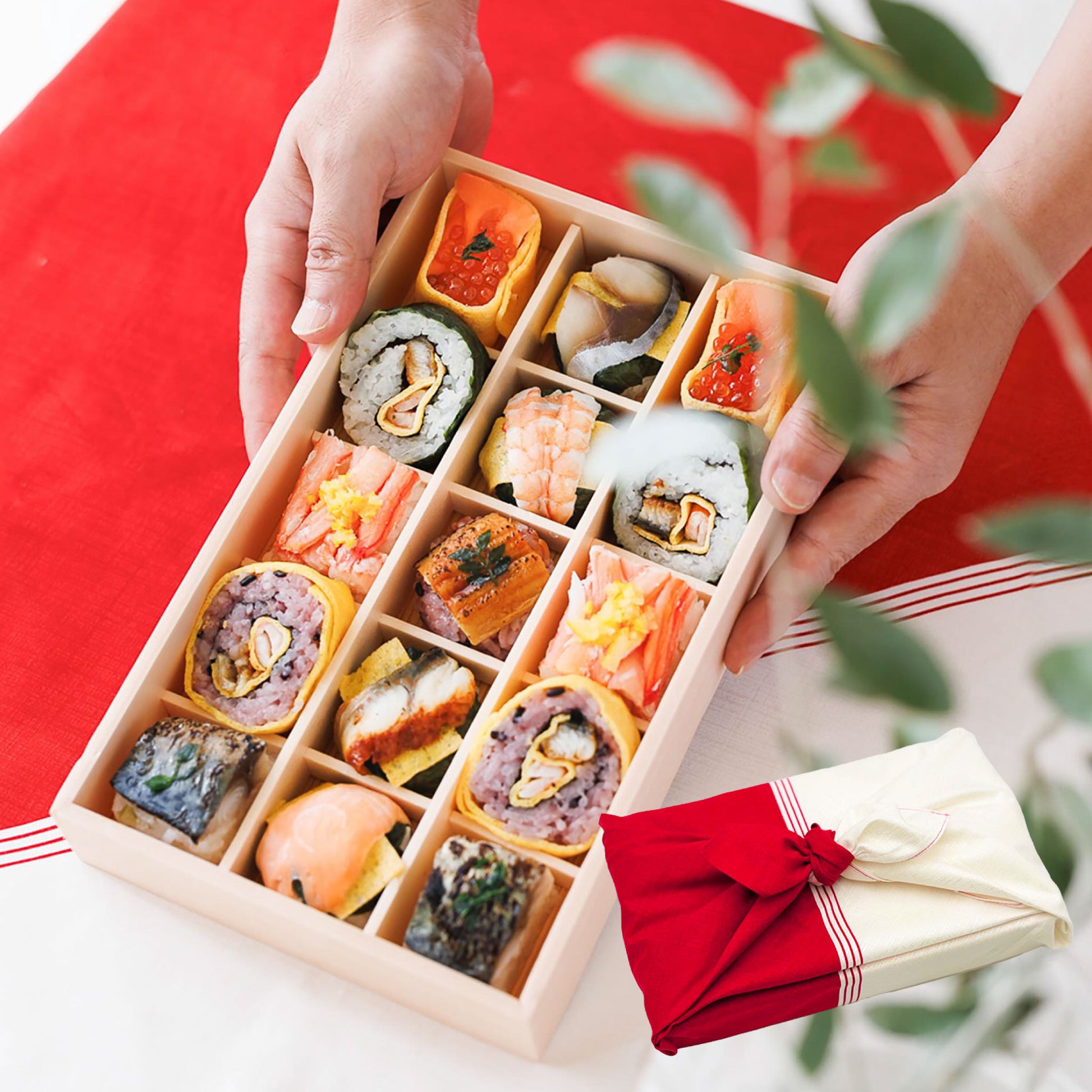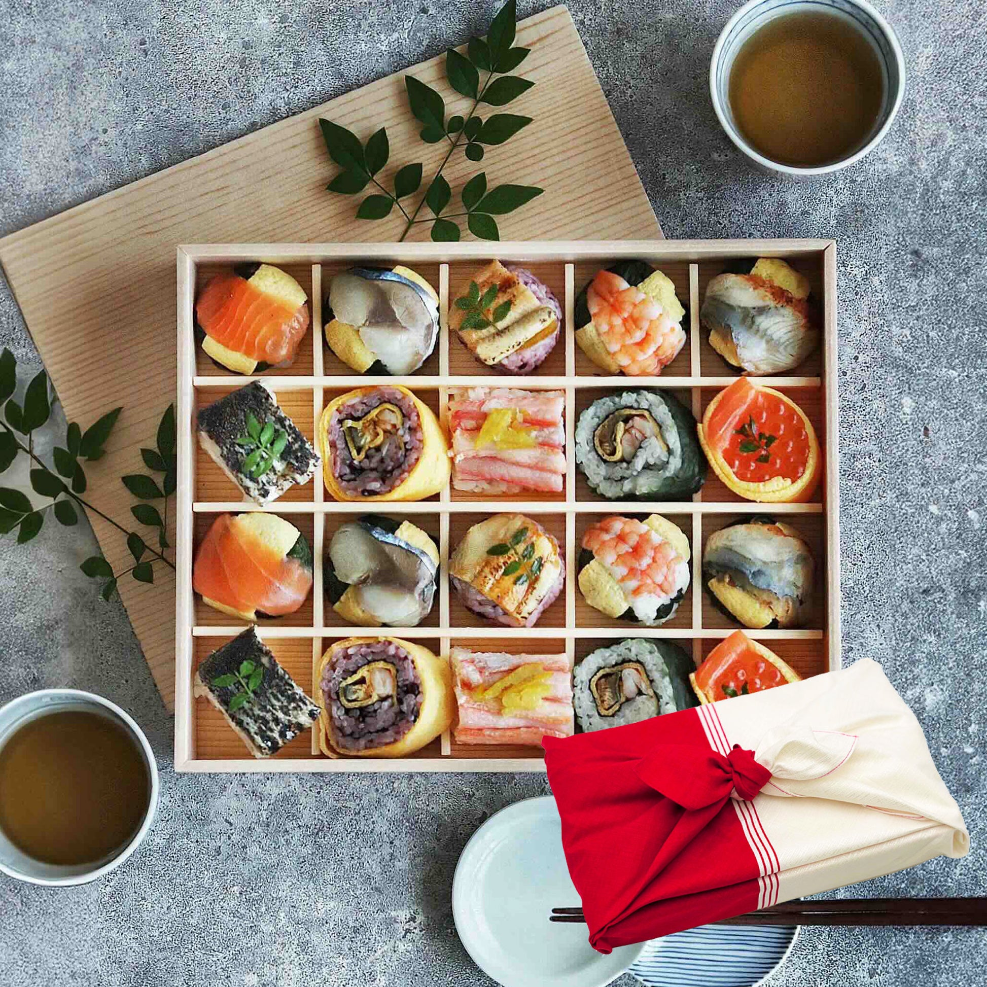 手鞠わさび葉寿し 鮭/手鞠わさび葉寿し 鯖/古代あなら寿し/手鞠わさび葉寿し 海老/手鞠わさび葉寿し 鰻/梅酢炙り鯖棒寿司/古代巻/紅ずわいがに棒寿司/わさび巻/鮭いくら錦糸巻(10種類各2個)