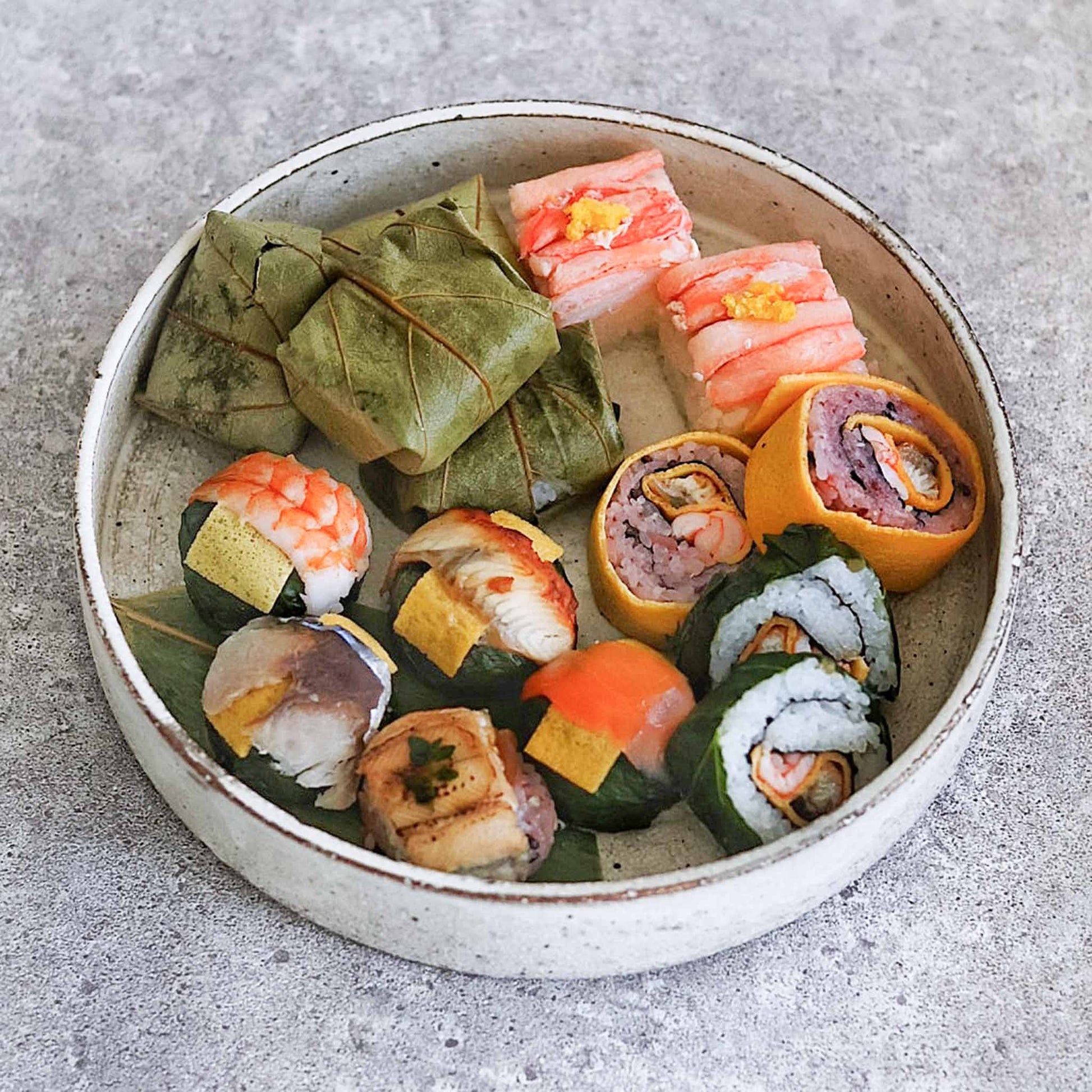 手鞠わさび葉寿し 鮭/手鞠わさび葉寿し 鯖/手鞠わさび葉寿し 海老/手鞠わさび葉寿し 鰻/古代あなら寿し(5種類各1個)