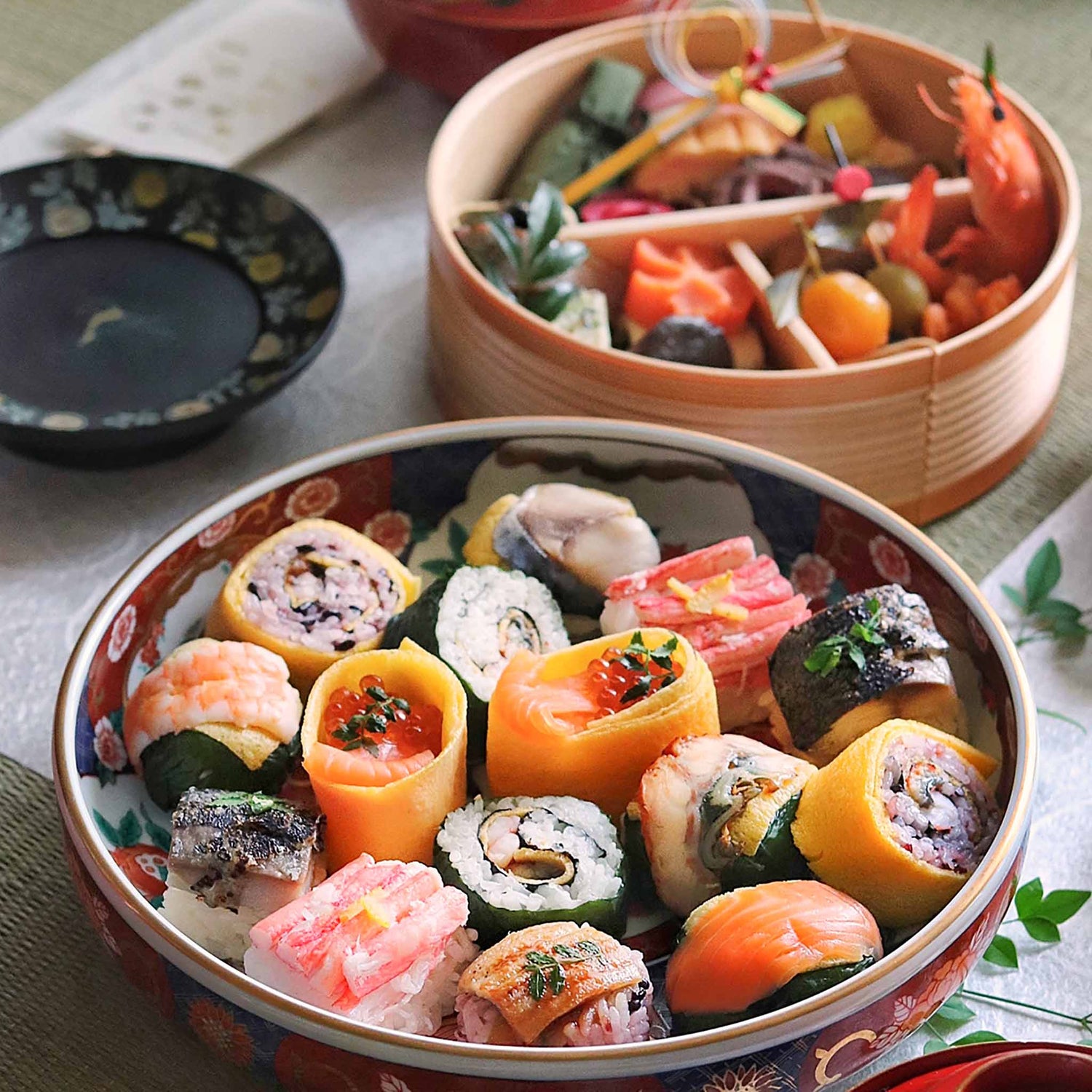 その他にも、紅ずわいがに棒寿司や、梅酢炙り鯖棒寿司などの色鮮やかなお寿司をお楽しみいただけます。ものを包み「結ぶ」ことから縁起が良いとされる「風呂敷」包みでお届けします。
