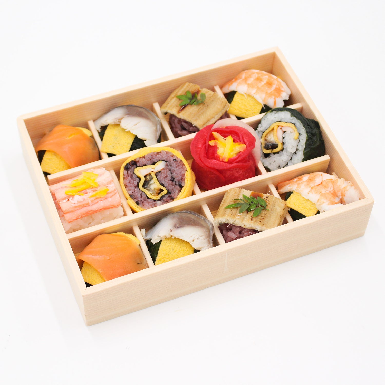 目にも鮮やかな紅白が目をひく紅白華手鞠を真ん中に、紅ずわいがに棒寿司など贅沢な食材が華やかに食卓を彩ります。心ときめく、ころんと愛らしい手鞠寿し8種12個セットをお楽しみください。